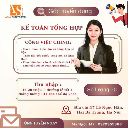 Để phục vụ mở rộng hoạt động kinh doanh, Asia Sun tuyển dụng vị trí Kế toán tổng hợp cho Văn phòng Hà Nội. Cụ thể như sau: