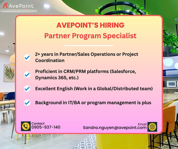 Một chiếc job mới hot hòn họt "Partner Program Specialist" tại nhà AvePoint đang mở dành cho các bạn có tiếng Anh tốt, kinh nghiệm quản lý vận hành và kỹ năng hệ thống để thử sức nha. Cùng check-in job nhen 👇