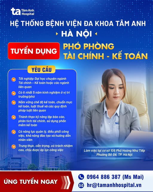 Hot cuối năm - Tuyển dụng vị trí PHÓ PHÒNG TÀI CHÍNH - KẾ TOÁN làm việc tại Hệ thống Bệnh viện Đa khoa Tâm Anh Hà Nội.
