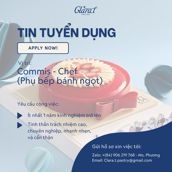 Clara.T Pastry mở rộng đội ngũ bếp, tìm kiếm Thợ bánh ngọt và Bếp phó bánh ngọt (Sous Chef) yêu nghề, chuyên nghiệp, ưu tiên gắn bó lâu dài trong môi trường bánh ngọt Pháp thủ công.