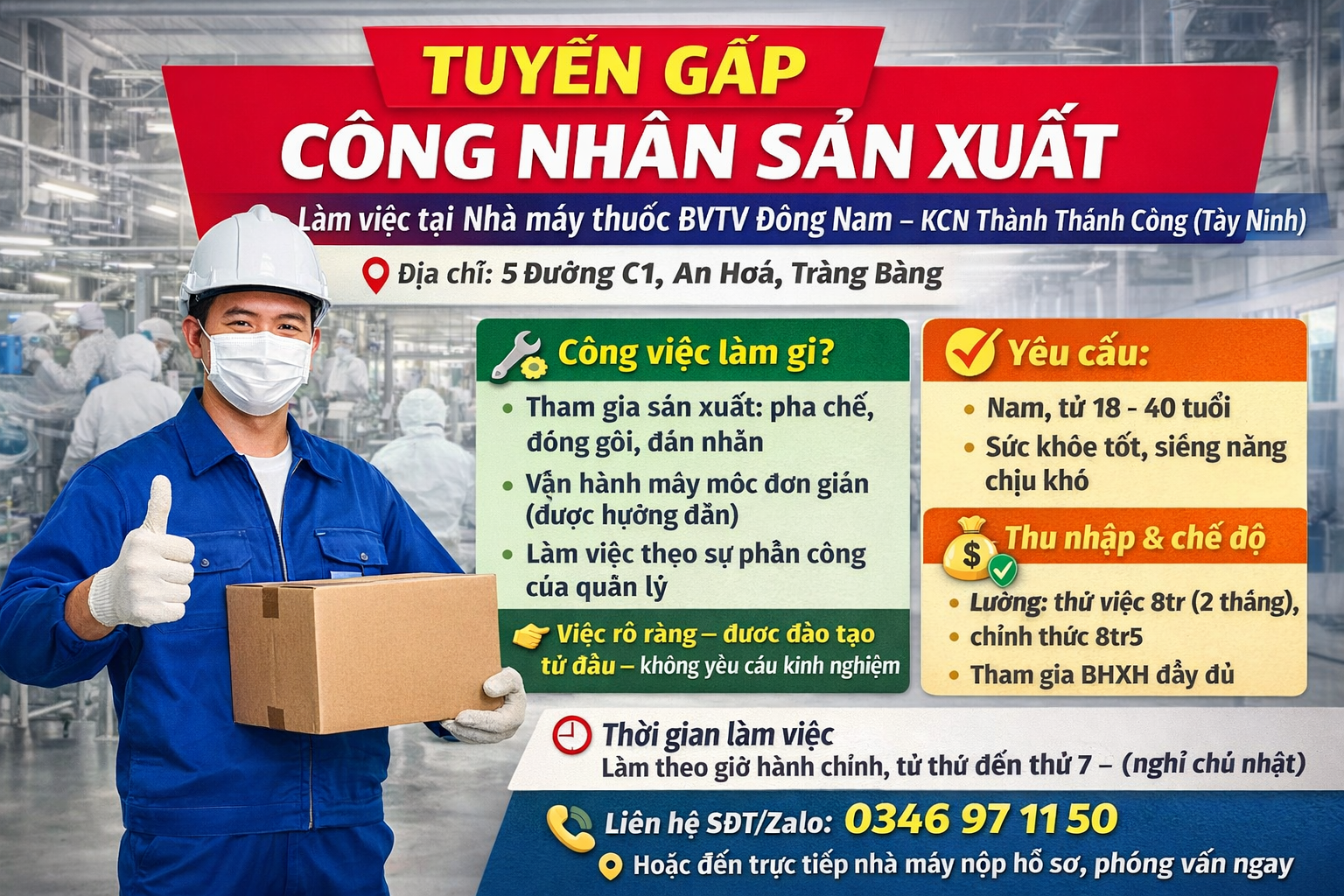 📍 Làm việc tại Nhà máy thuốc BVTV Đông Nam – Địa chỉ: Lô A8-5 Đường C1, An Hoà, Trảng Bàng (Khu công nghiệp Thành Thành Công)