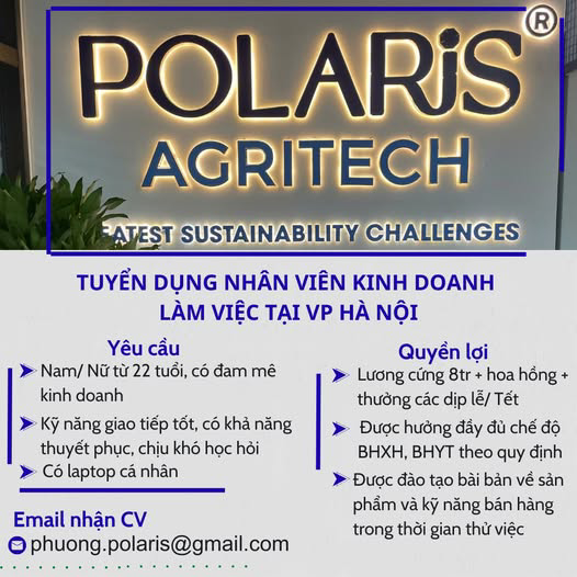 CÔNG TY CỔ PHẦN CÔNG NGHỆ NÔNG NGHIỆP POLARIS chuyên nhập khẩu và phân phối phân bón cần tuyển dụng: