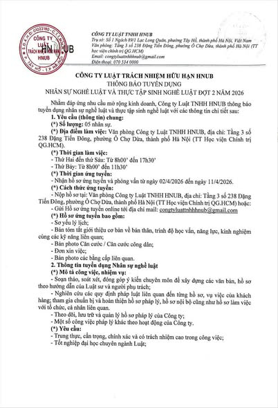 - Nộp hồ sơ ứng tuyển trực tiếp tại Văn phòng Công ty Luật TNHH HNUB, địa chỉ: Tầng 3, số 238 Đặng Tiến Đông, phường Ô Chợ Dừa, Hà Nội hoặc