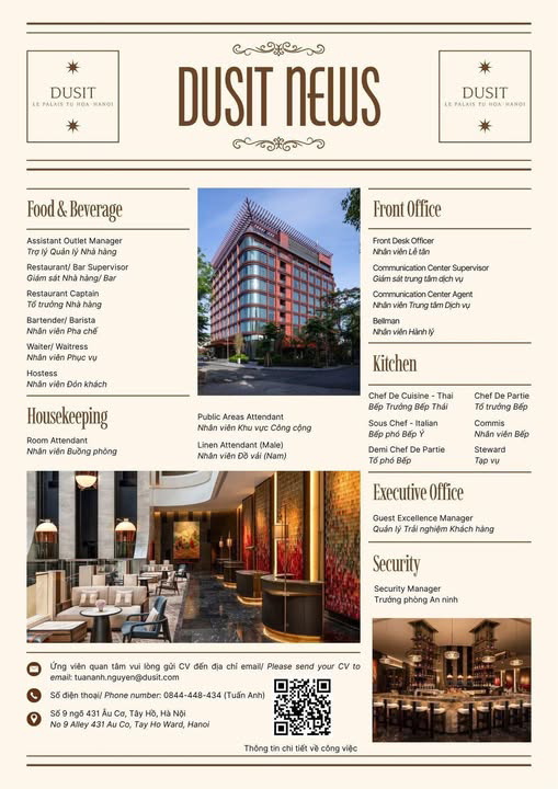 Tháng 4 gõ cửa mang theo những nguồn năng lượng mới! Để chuẩn bị cho một mùa hè bùng nổ, Dusit Le Palais Tu Hoa Hanoi đang tìm kiếm những "mảnh ghép" tài năng, nhiệt huyết để cùng chúng tôi kiến tạo nên những trải nghiệm dịch vụ đẳng cấp thế giới.