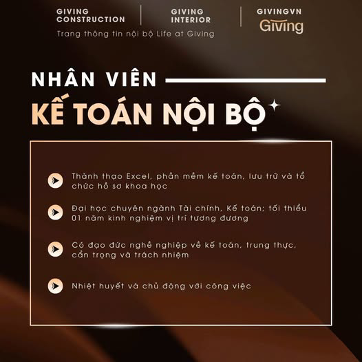 Nhằm đáp ứng tốc độ tăng trưởng trong thời gian tới, Giving hiện đang tìm những ứng viên tài năng cho vị trí Kế toán nội bộ để cùng đồng hành và phát triển cùng công ty.
