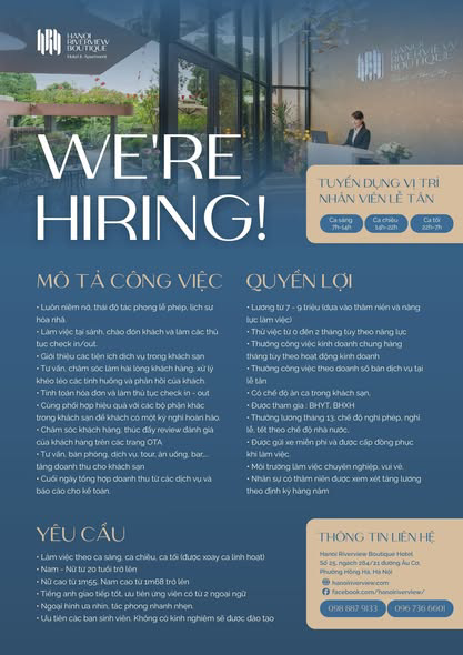Hanoi Riverview Boutique Hotel trân trọng tìm kiếm những ứng viên phù hợp gia nhập đội ngũ, cùng chúng tôi kiến tạo trải nghiệm dịch vụ tinh tế và chuyên nghiệp cho khách hàng.