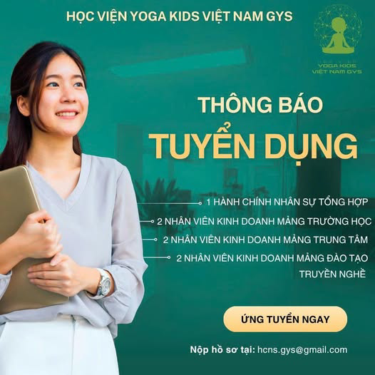 Học viện Yoga Kids Việt Nam GYS rất mong được đồng hành cùng những nhân sự có tâm, có trách nhiệm và cùng chung khát vọng xây dựng một môi trường giáo dục bình an, chuyên nghiệp.