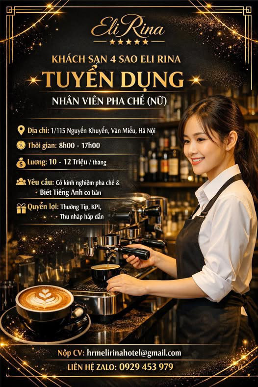 📌 Vị trí: Nhân viên Pha chế – Coffee Bar khách sạn ( Barista)