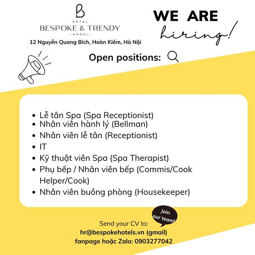 Để mở rộng mô hình kinh doanh nhà hàng khách sạn, Khách sạn Bespoke Trendy Hanoi, tọa lạc tại số 12 Nguyễn Quang Bích, Hoàn Kiếm, Hà Nội, hiện đang tìm kiếm những tài năng và đam mê công việc cho các vị trí sau để sẵn sàng đồng hành và phát triển: