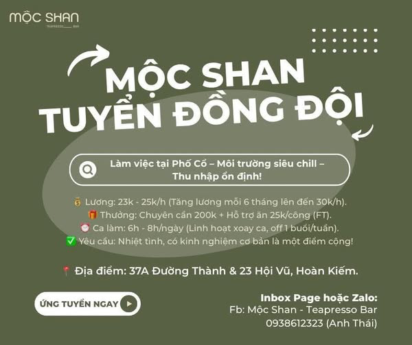 Bạn yêu thích mùi thơm của trà ủ máy, muốn làm việc tại trung tâm phố cổ "xịn xò" và đang tìm một môi trường Gen Z năng động? Về chung nhà với Mộc Shan ngay thôi! Chúng mình đang tuyển Nhân viên linh hoạt vị trí cho cả 2 cơ sở đây!