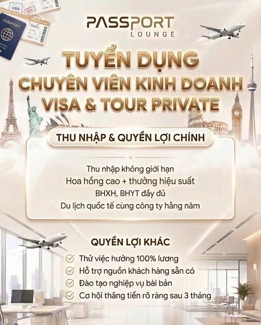 Passport Lounge Hà Nội đang tuyển Nhân sự Kinh doanh làm việc trong lĩnh vực visa, tour và combo du lịch.