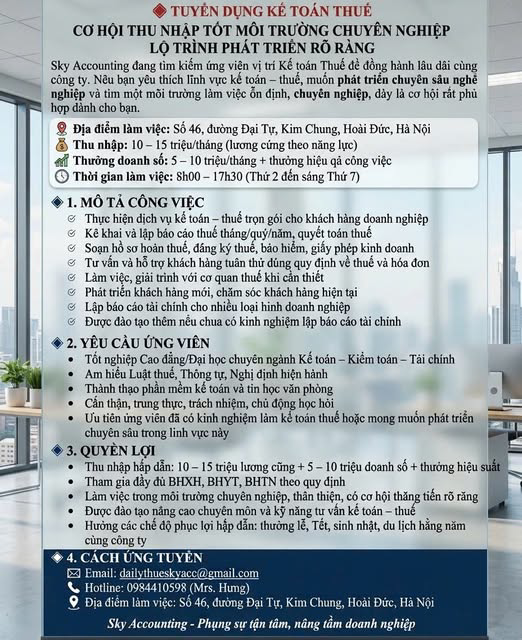✨ Sky Accounting tuyển dụng vị trí Kế toán Thuế làm việc tại Hoài Đức, Hà Nội.