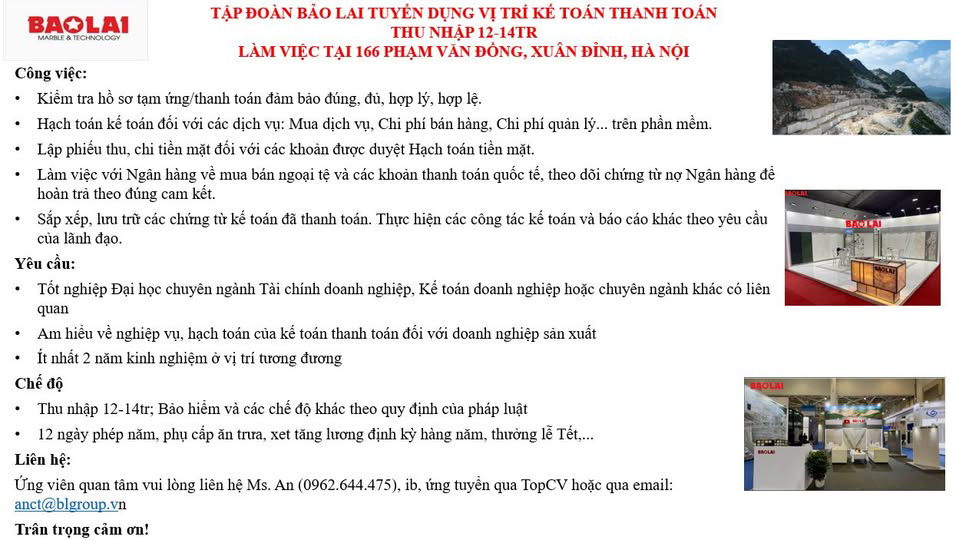 TUYỂN DỤNG VỊ TRÍ KẾ TOÁN THANH TOÁN