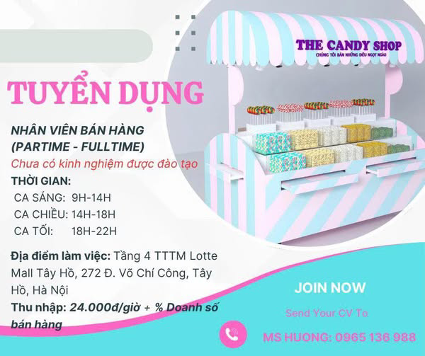 🔸Địa điểm làm việc Lotte mall Tây Hồ 272 Võ Chí Công, Phú Thượng,Tây Hồ Hà Nội ✅ Thời Gian: ca sáng : 9h - 14h