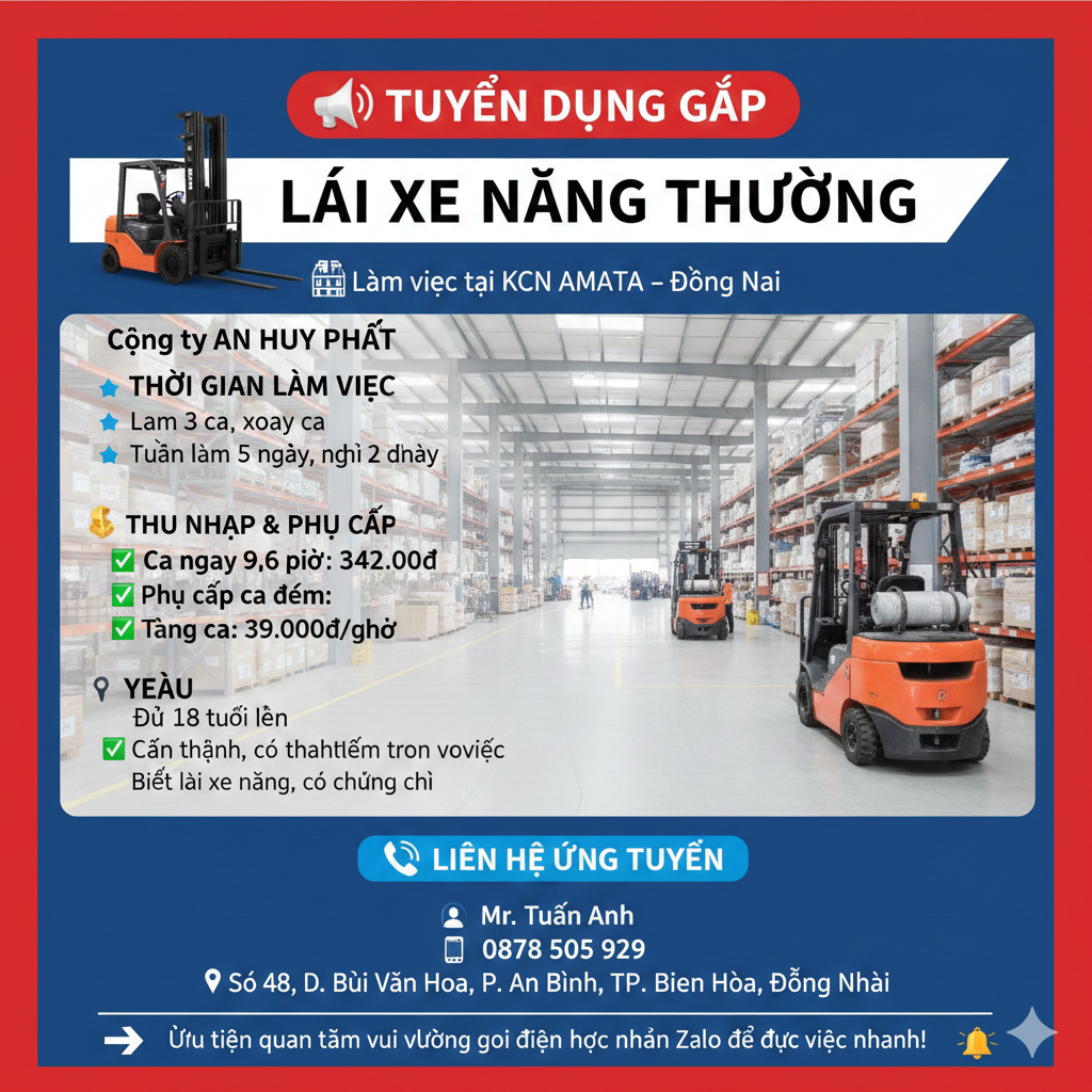 Mô tả công việc: - Tuyển dụng LÁI XE NÂNG THƯỜNG - Lái xe nâng tại KCN AMATA – Đồng Nai - Công việc ổn định, thu nhập rõ ràng Thời gian làm việc: - Làm 3 ca, xoay ca - Tuần làm 5 ngày, nghỉ 2 ngày Quyền lợi: - Ca ngày 9,6 giờ: 342.000đ - Phụ cấp ca đêm: 63.000đ - Tăng ca: 39.000đ/giờ Yêu cầu: - Đủ 18 tuổi trở lên - Cẩn thận, có trách nhiệm trong công việc - Biết lái xe nâng, có chứng chỉ Thông tin về công ty: - AN HUY PHÁT - Địa chỉ: KCN AMATA – Biên Hòa, Đồng Nai